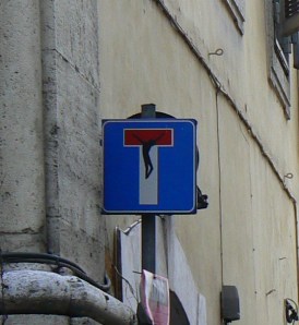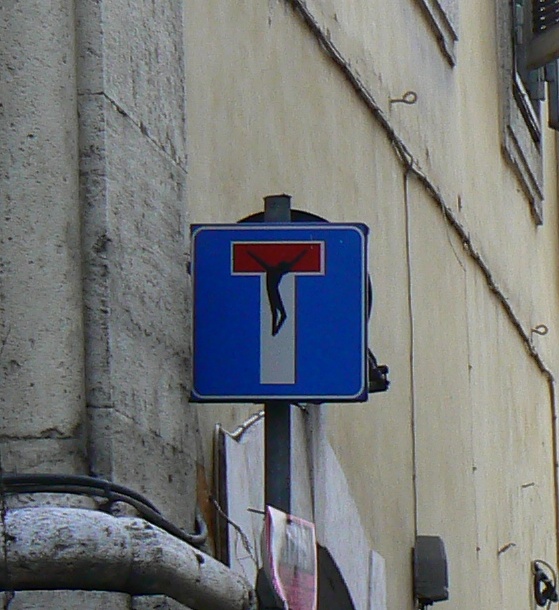 In Rome recently, I came across a dead end road sign that had been creatively altered to become a crucifix. I like these quirky graphics in the style of Clet Abraham, so I eagerly took a picture of it.